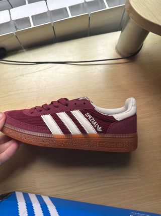 Zapatilla deportiva Adidas Spezial con un diseño clásico y moderno. - Parte superior de ante y pana. - Tres rayas laterales blancas. - Detalle Spezial en el lateral. - Suela de goma marrón. - Cierre de cordones.