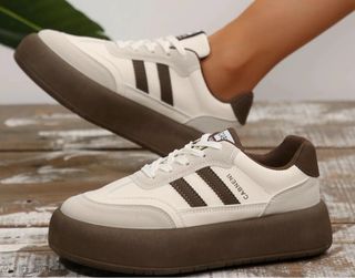 Zapatillas deportivas con un diseño moderno y cómodo. - Combinación de colores blanco y marrón. - Suela gruesa y llamativa. - Detalle de tres franjas laterales.