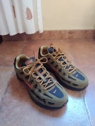 Zapatillas deportivas Nike con un diseño moderno y llamativo. - Combinación de colores verde oliva y detalles en naranja. - Logotipo de Nike visible en el lateral. - Solo 2 usos, prácticamente nuevos.