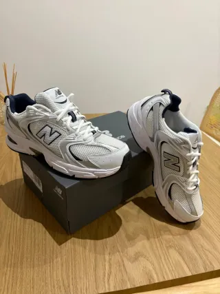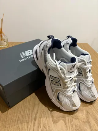 Zapatillas deportivas New Balance modelo 530. - Diseño en malla transpirable. - Detalles en color azul marino. - Suela blanca con amortiguación. Totalmente nuevas. Fue un regalo de reyes y las vendo por error en el número y no poder devolverlas por haber pasado el plazo. 100% originales De la web de sarenza, su precio original es de 120€