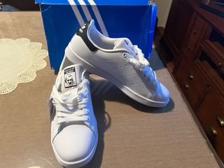 Zapatillas Adidas Stan Smith en color blanco y negro, talla 45.1/3 NUEVAS sin estrenar - Cierre de cordones. - Diseño clásico. - Logo de Adidas en el talón.