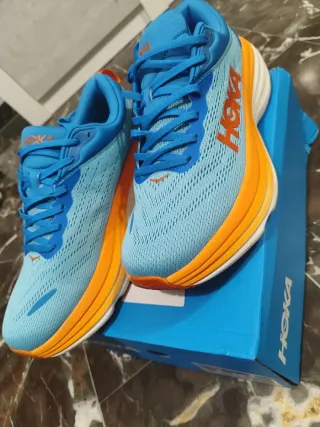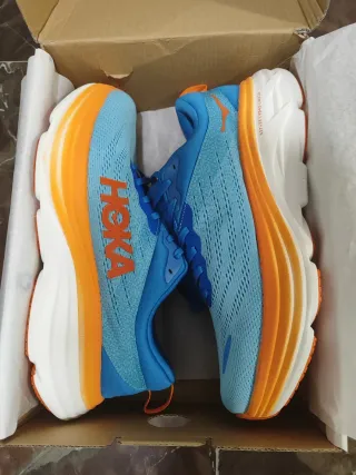 Zapatillas Hoka Bondi 8 en talla 44. Combinan tonos azules y naranjas vibrantes. - Diseño de malla transpirable. - Suela gruesa con amortiguación. - Detalle del logo Hoka en el lateral. ¡NUEVAS SIN ESTRENAR!