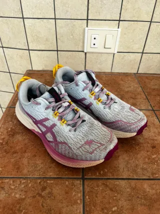 Zapatillas deportivas Asics para mujer. - Diseño moderno en tonos morados y rosas. - Ideales para running o entrenamiento. - Cierre con cordones. - Talla 39.5