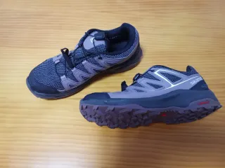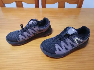 Zapatillas de montaña Salomon en color negro y morado.usadas dolo una vez Perfectas para senderismo y actividades al aire libre. - Diseño deportivo y resistente. - Suela con buen agarre. - Cierre rápido.