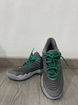 Zapatillas de baloncesto Nike Giannis Immortality 4 en color gris con detalles verdes. - Diseño moderno y deportivo. - Cordones verdes. - Suela blanca.