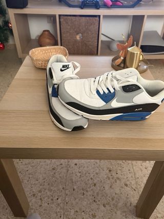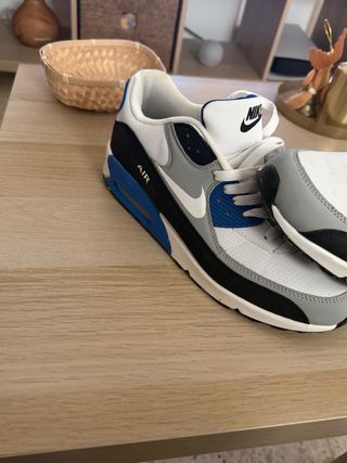 Zapatillas deportivas Nike Air Max con un diseño moderno y llamativo. - Combinación de colores azul, gris y blanco. - Detalle de la marca AIR en el lateral.