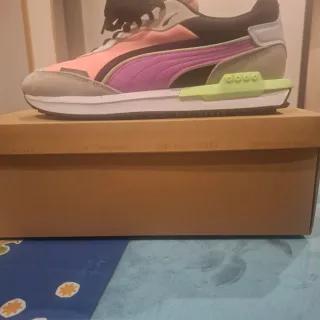 Zapatillas Puma de mujer en talla 38. Combinan tonos vibrantes para un estilo único. - Diseño moderno con detalles en rosa y morado. - Suela blanca y gruesa. - Paneles laterales con el logo de Puma.