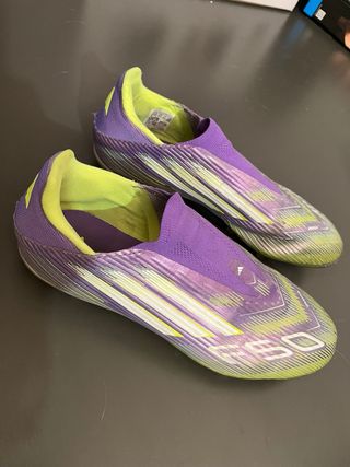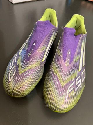 Zapatillas de fútbol Adidas F50 Sprintgrid con un diseño llamativo. 41 1/3 - Combinación de colores morado y verde. - Detalles de líneas en el diseño. - Logo de Adidas visible.