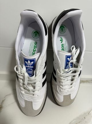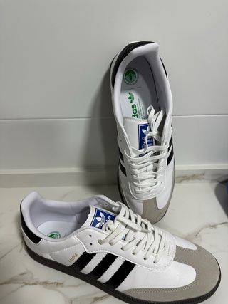 Zapatillas Adidas Samba en blanco y gris. Un clásico atemporal. - Diseño icónico de Adidas. - Detalles en gamuza. - Suela de goma. - Logo de Adidas en la lengüeta.