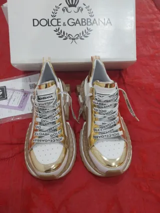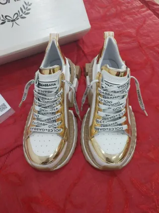 Zapatillas deportivas de Dolce & Gabbana con un diseño llamativo. - Unisex para hombre o mujer. - Combinación de colores oro y blanco. - Cordones con logo de la marca. - Suela gruesa y moderna. - Talla 41