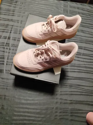 Zapatillas deportivas Adidas Courtblock en color rosa. Un diseño clásico y versátil. El número es el 41 y 1/3, pero, dan muy poca talla. Yo tengo el 41 y me van pequeñas. Usadas una vez. - Cierre con cordones. - Detalle de las tres bandas. - Suela de goma.