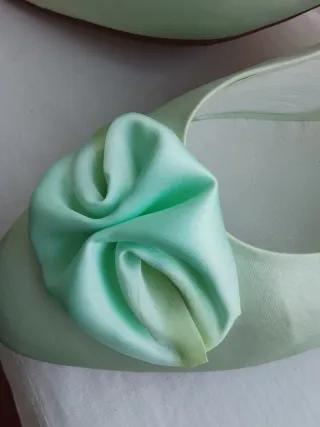Elegantes zapatillas de raso con suela de cuero - Color verde menta. - Adorno de lazo en la punta, se ven unas marca amarillas a consecuencia de la pega que utilizan y unos pequeños puntos negros, las delo a 4 € por este motivo - Diseño tipo mule destalonado.