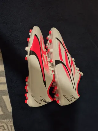 Zapatilla de fútbol Puma en talla 42. Diseño moderno con detalles en rosa y blanco. - Parte superior de material sintético. - Suela con tacos para césped. - Cierre con cordones.
