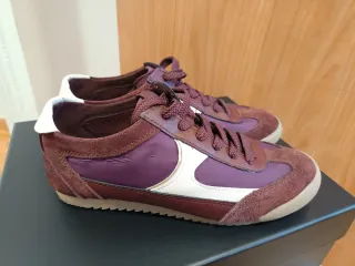 Zapatillas de ante con detalles en morado y marrón. - Cierre con cordones. - Detalle lateral en blanco y dorado. - Suela de goma. Como nuevos puestos en pocas ocasiones, limpios y muy cómodos.