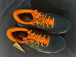 Zapatillas deportivas ASICS con un diseño moderno y llamativo. - Combinación de colores negro y naranja. - Detalle de logo en la plantilla. - Cordones naranjas. - Cuello acolchado naranja.