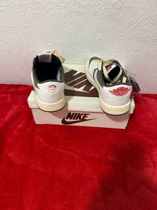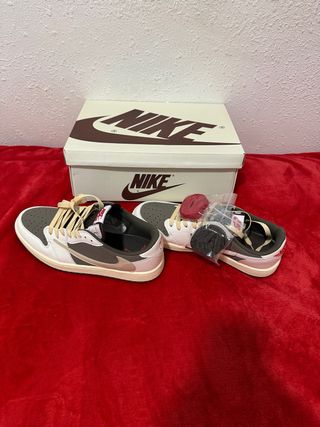 Zapatillas Nike Jordan x Travis Scott. - Diseño bajo. - Combinación de colores marrón y blanco. - Incluye cordones adicionales.