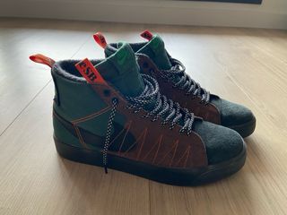 Zapatillas altas Nike SB Zoom Blazer Premium con un diseño único. - Combinación de ante y tejido resistente. - Detalles de costuras en naranja. - Swoosh lateral en negro. - Cordones a contraste. - Tirador trasero para facilitar el calce.