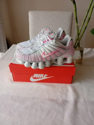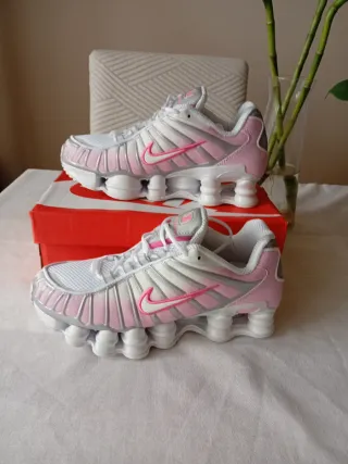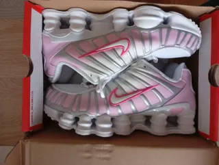 Zapatillas deportivas Nike Shox con un diseño moderno y llamativo. - Combinación de colores rosa y blanco. - Detalle de Swoosh en rosa. - Suela con tecnología Shox.