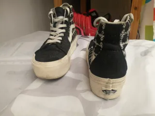 Zapatillas de plataforma de la marca Vans con un diseño llamativo. - Color principal negro con detalles blancos. - Estampado de pequeños motivos blancos sobre el tejido negro. - Suela de plataforma gruesa en color blanco de 5cm