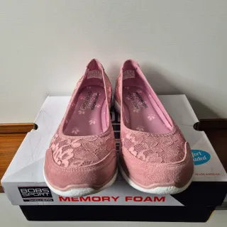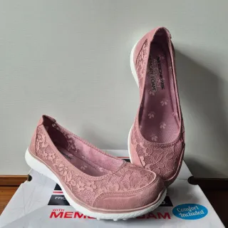 Zapatillas deportivas Skechers Bobs Squad para mujer en color rosa. Presentan un diseño con encaje floral y suela blanca. - Detalle de encaje floral. - Suela blanca. - Plantilla Air-Cooled Memory Foam.