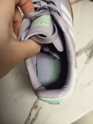 Zapatillas deportivas Adidas con un diseño moderno y cómodo. - Combinación de colores morado y blanco. - Detalle de las icónicas tres rayas.