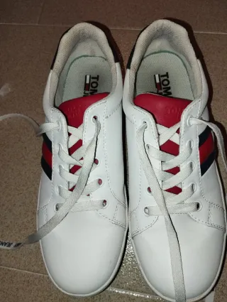 Zapatillas de la marca Tommy Hilfiger en color blanco con detalles en rojo y azul. - Diseño deportivo y casual. - Cordones blancos y con logo - Logo de la marca en la lengüeta y la suela. Están impecables