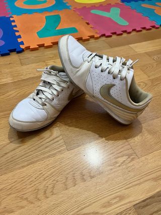 Zapatillas deportivas de la marca Nike en talla 38. - Diseño en color blanco con detalles dorados. - Parte superior con perforaciones. - Cierre con cordones.