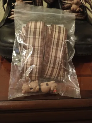Set de accesorios para personalizar tus zapatillas. Incluye dos lazos a cuadros y dos adornos de capibaras. - Dos lazos de tela a cuadros marrones y beige. - Dos adornos con forma de capibara para los cordones.