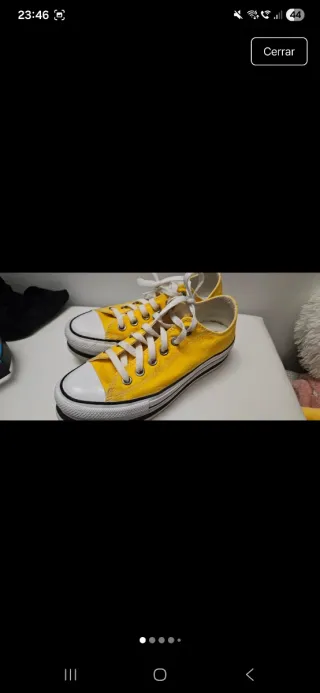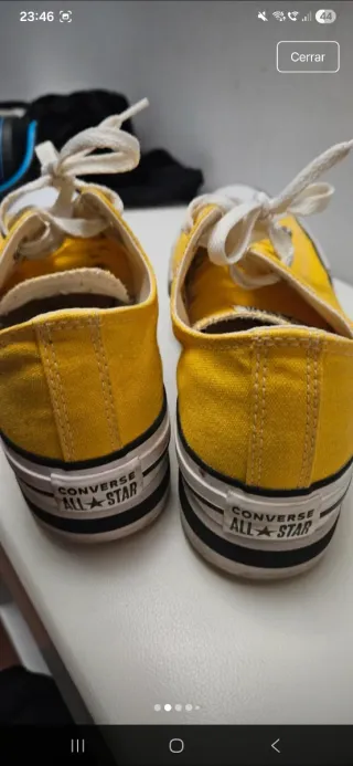 Zapatillas bajas de la marca Converse en llamativo color amarillo. Perfectas para un look casual y cómodo, poco uso. Plataforma Y regalo un par Negras misma talla. 2x1 - Cierre con cordones blancos. - Punta reforzada. - Suela de goma blanca.