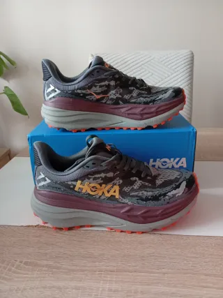 Zapatillas deportivas Hoka con un diseño moderno y llamativo. - Parte superior con estampado de camuflaje. - Detalles en color naranja. - Suela gruesa para mayor amortiguación.