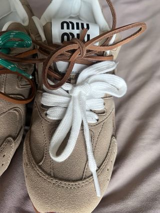 Zapatillas deportivas Miu de NB Combinan materiales de ante y detalles en cuero. - Cordones en color verde con detalles blancos. - Cordones adicionales en color cuero. - Detalle de logo en la lengüeta.