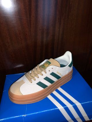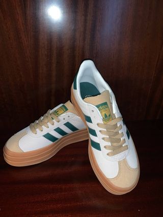 Zapatillas Adidas Gazelle Bold en talla 37, a estrenar. Diseño moderno en color blanco con detalles en verde y ante. Plataforma gruesa para un look actual. Cordones en tono camel.