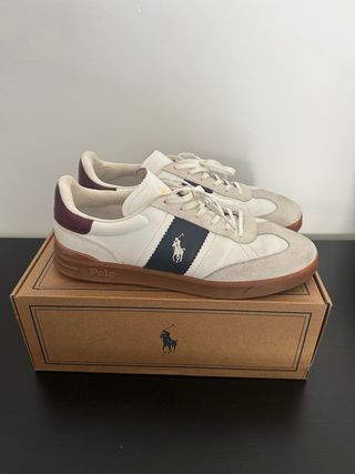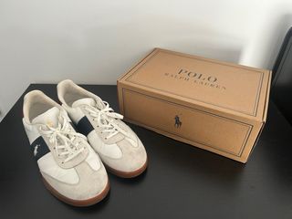 Zapatillas Polo Ralph Lauren Heritage Aera en muy buen estado, apenas usadas (2-3 veces). Modelo clásico de piel con suela de goma caramelo, diseño elegante y cómodo, perfectas para estilo casual o urbano. Incluyen logo icónico de Polo en el lateral y están impecables (sin marcas evidentes de desgaste). 📌 Detalles: • Marca: Polo Ralph Lauren • Modelo: Heritage Aera • Material: Piel + Ante • Estado: Muy buen estado (casi nuevas) • Uso: ~2-3 veces • Sin marcas ni estragos visibles
