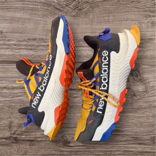 Zapatillas deportivas New Balance con un diseño vibrante y moderno. - Combinación de colores llamativa: negro, azul, naranja y amarillo. - Cordones amarillos. - Suela con buen agarre.