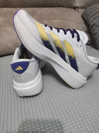 Zapatillas deportivas Adidas adizero sin estrenar. - Diseño moderno en blanco con detalles en morado y amarillo. - Cordones morados. - Suela blanca con detalles morados.