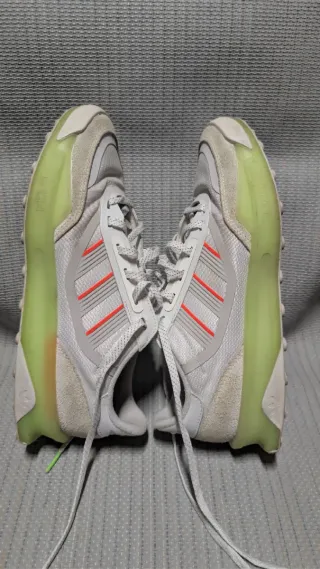 Zapatillas deportivas Adidas con un diseño moderno y llamativo. - Combinación de colores verde y blanco. - Detalles de tres rayas en color naranja. - Suela translúcida con un toque de color. - Materiales textiles y ante.