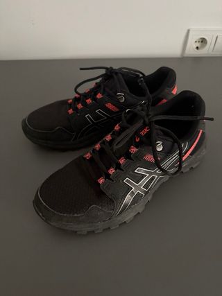 Zapatillas deportivas Asics Gel con un diseño moderno y detalles llamativos. - Combinación de colores negro y rojo. - Logo de Asics en los laterales. - Cordones con detalles en zigzag.