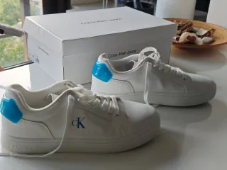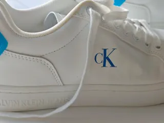 Zapatillas de la marca Calvin Klein Jeans en color blanco y con detalles en azul. Utilizadas un par de veces - Diseño moderno y casual. - Cierre con cordones. - Logo de la marca en el lateral.