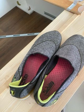 Zapatillas cómodas de la marca Skechers. - Exterior de tela jaspeada en gris. - Detalle interior en color verde lima. - Suela de goma. No pesan nada.