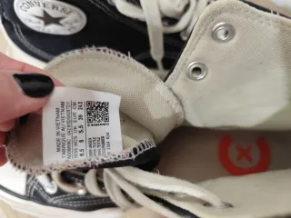 Zapatillas de caña baja con un diseño distintivo. - Parte superior de lona negra. - Suela de goma blanca con efecto desgastado. - Cordones blancos. - Ojales metálicos. Precio negociable