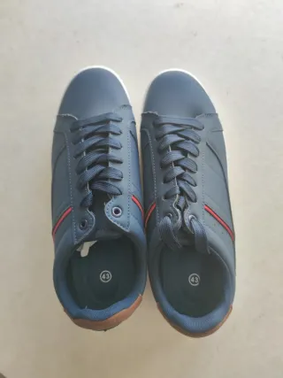 Zapatillas deportivas de color azul, talla 43. Diseño moderno y cómodo. Tipo Lacoste. - Cierre con cordones. - Detalle de líneas rojas en los laterales. - Suela blanca. - Logo de la talla en la plantilla.