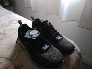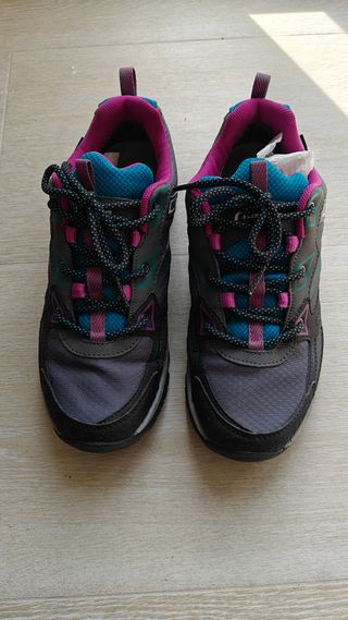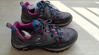 Zapatillas de trekking. Una hora puestas por casa. Error en la talla, me quedan grandes. - Cordones rojos con detalles negros. - Ojales metálicos para los cordones. - Lengüeta y cuello acolchados para mayor comodidad. - Suela de goma resistente.