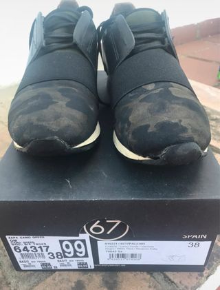 Zapatillas urbanas de la marca Sixtyseven con un diseño camuflado. - Modelo: Zapa Camo Green. - Talla: 38. - Color: Negro / Menta Oliva / Neopreno Kaky.