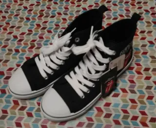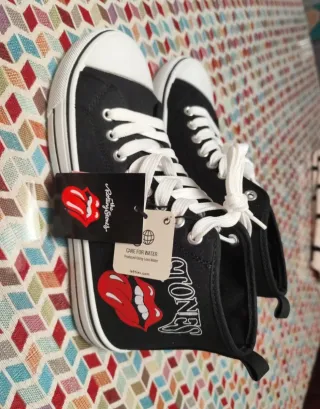 Zapatillas de lona con diseño inspirado en The Rolling Stones. - Color negro con detalles en rojo. - Estampado icónico de la banda. - Cierre con cordones blancos. - Suela de goma blanca.
