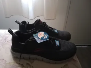 Zapatillas Skechers en color negro y gris, talla 45. Cuentan con plantilla de espuma viscoelástica para mayor comodidad. - Plantilla Memory Foam extra cómoda. - Aptas para lavado a máquina.