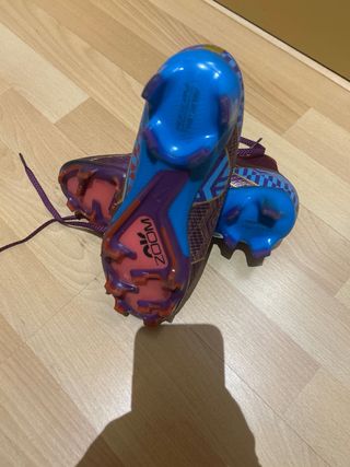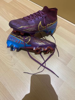 Zapatillas de fútbol Nike Mercurial con un diseño llamativo. - Color principal púrpura con detalles dorados. - Suela con tacos para césped. - Diseño de caña alta. Usadas dos veces