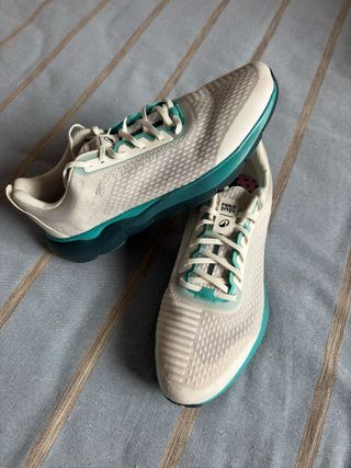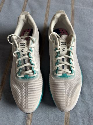 Zapatillas deportivas de Decathlon con diseño inspirado en los JJOO Paris 2024. - Color blanco y verde azulado. - Talla 47. como nuevas, solo un par de usos