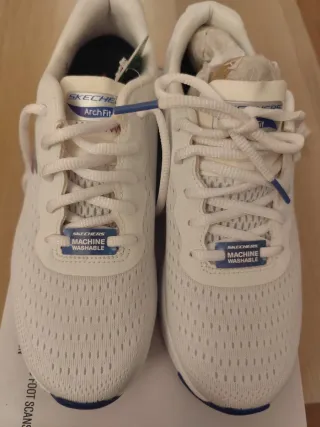 Zapatillas deportivas Skechers Arch Fit en color blanco y detalles azules. Perfectas para el día a día. - Diseño transpirable. - Suela con tecnología Arch Fit. - Aptas para lavado a máquina.