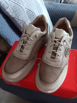 Zapatillas de ante color beige con detalles en blanco. - Diseño de caña baja. - Suela de goma. - Cierre con cordones.