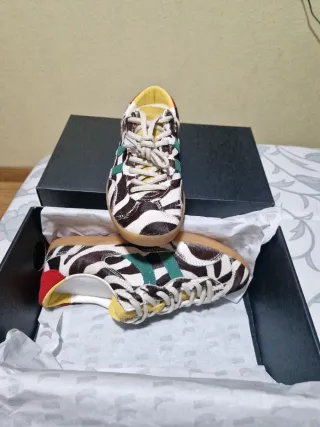 Zapatillas Adidas Gazelle con un diseño único y moderno. - Color beige con detalles en verde. - Talla 40.